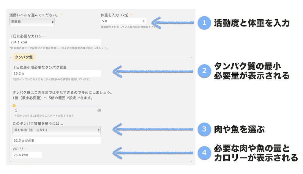 すでに手作り食を実践している場合は、必要な量のタンパク質をきちんと与えているかもう一度確認しましょう。当サイトの栄養自動計算機では、体重に合わせて必要な最低限の量のタンパク質量を計算することができます。