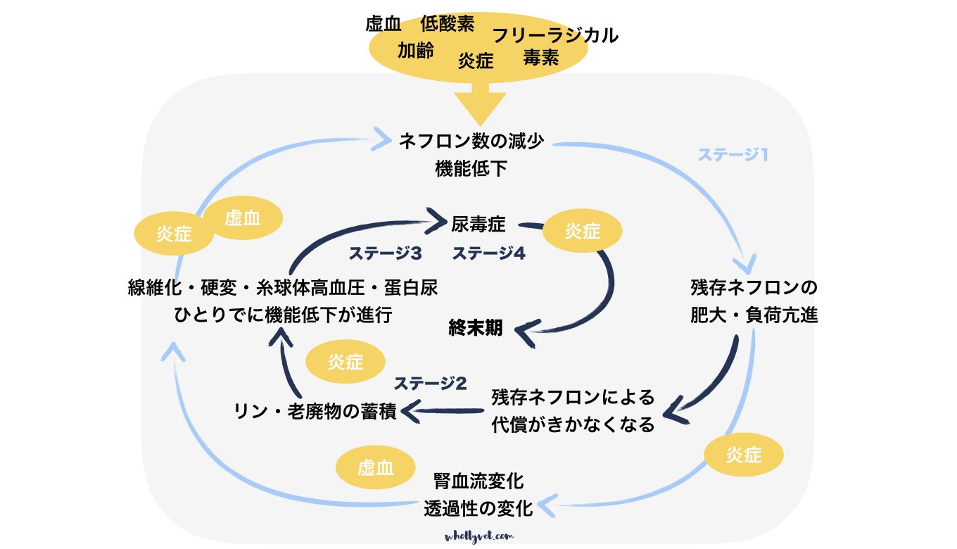 慢性腎臓病は数年かけて徐々に進行するため、診断された時点ではもうすでに元の原因がわからなくなっている場合がほとんどです。加齢、外傷、感染、免疫疾患、腫瘍、虚血、低酸素血症、毒素、腎毒性のある薬剤、遺伝など、さまざまな原因が考えられますが、これらに共通するのが炎症と腎血流量の低下です。